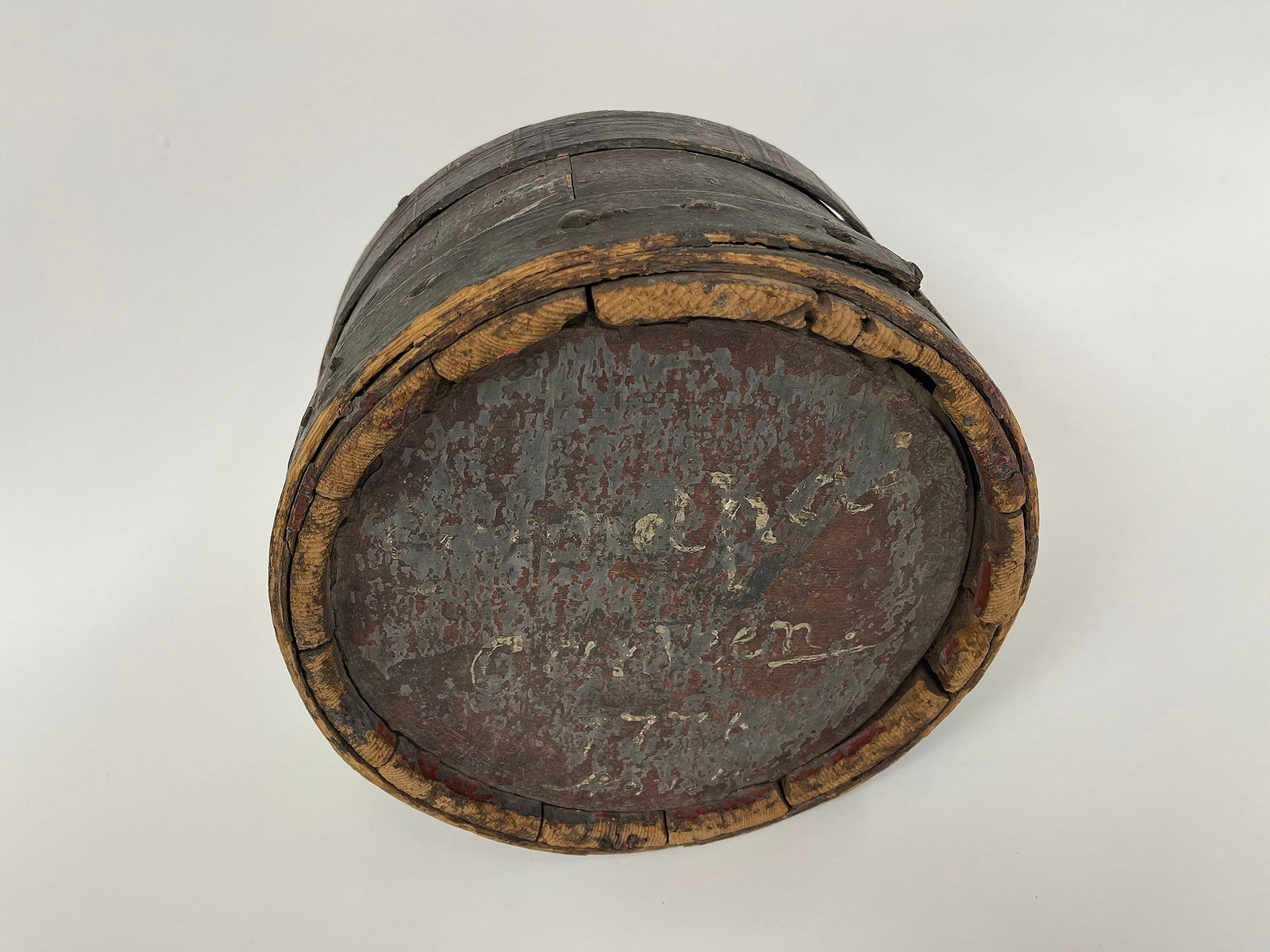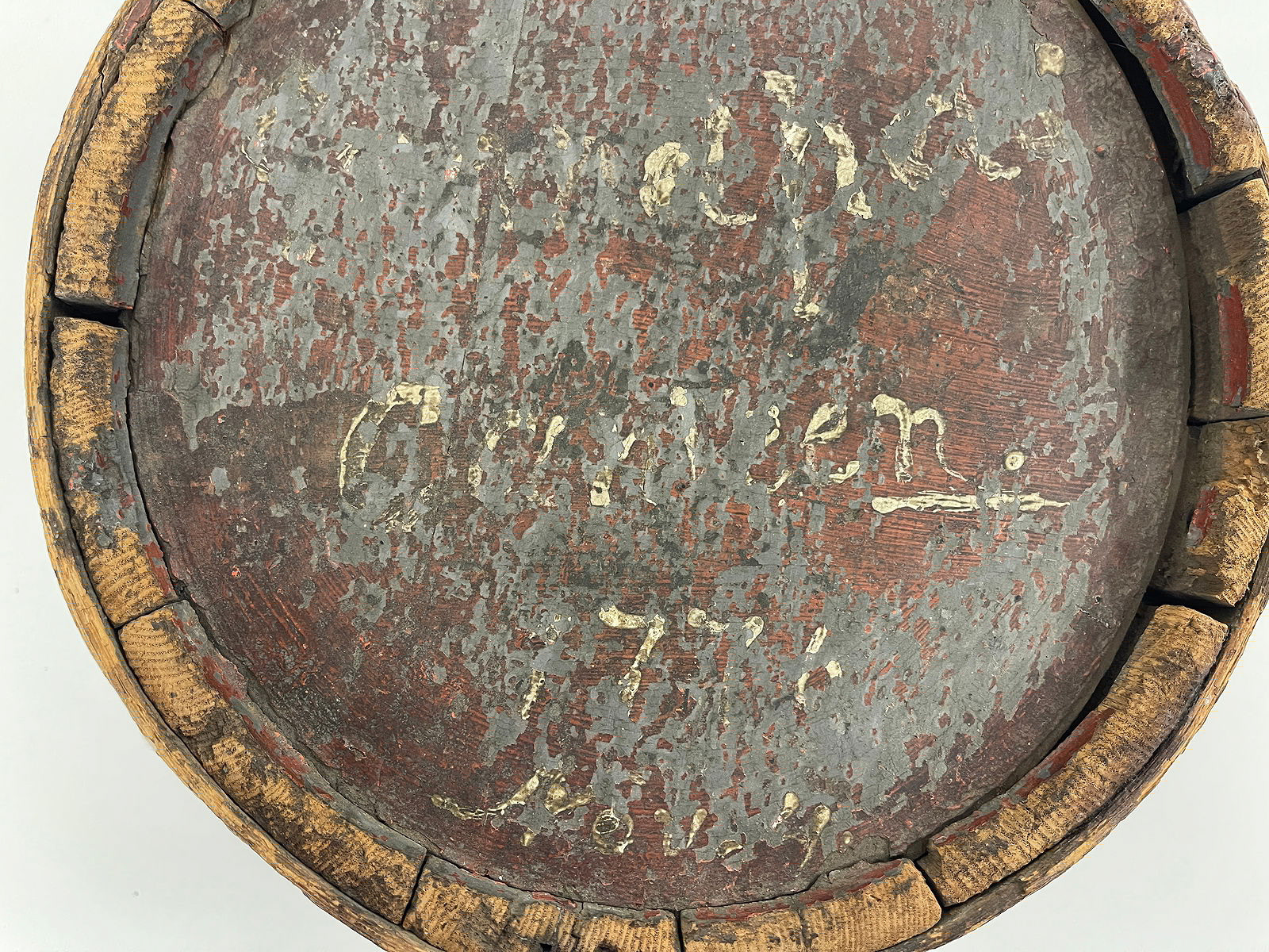 American Revolutionary War era "1776" dated wood canteen. Named at top (illegible, "Canteen 1776 Nov. 4" painted at the bottom - the date the Declaration of Independence gained its final signature from Matthew Thornton, a delegate from New Hampshire. Possibly a piece painted at the finalization of the Declaration to serve as a souvenir of the momentous day. Original surface.
