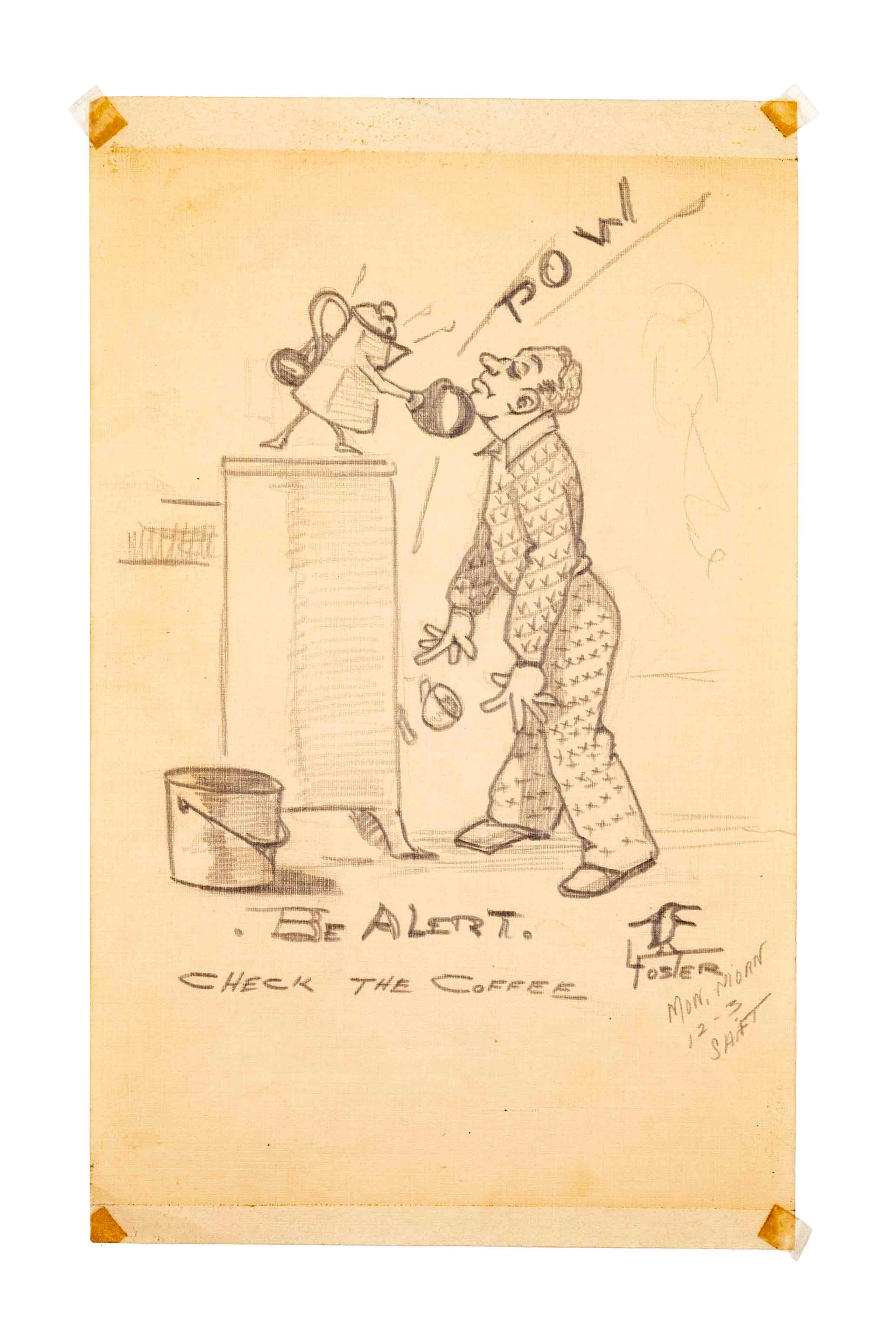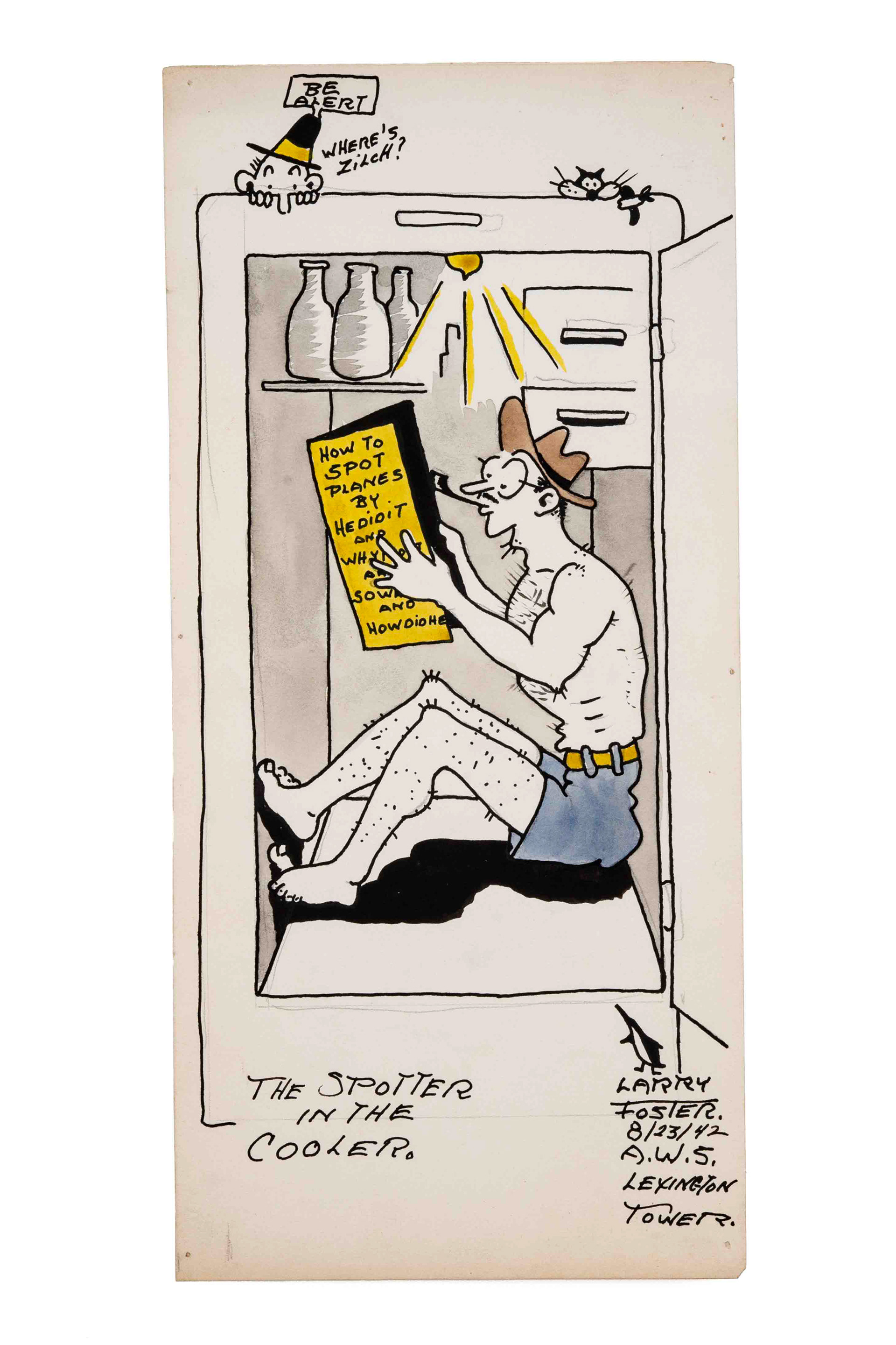 Incredible collection of 85 original illustrations from 1942 and 1943 by Larry Foster. Focusing on safety and training in the Aircraft Warning Service during WWII. Mostly ink and watercolor on board and paper. Still researching. These are currently unframed.
