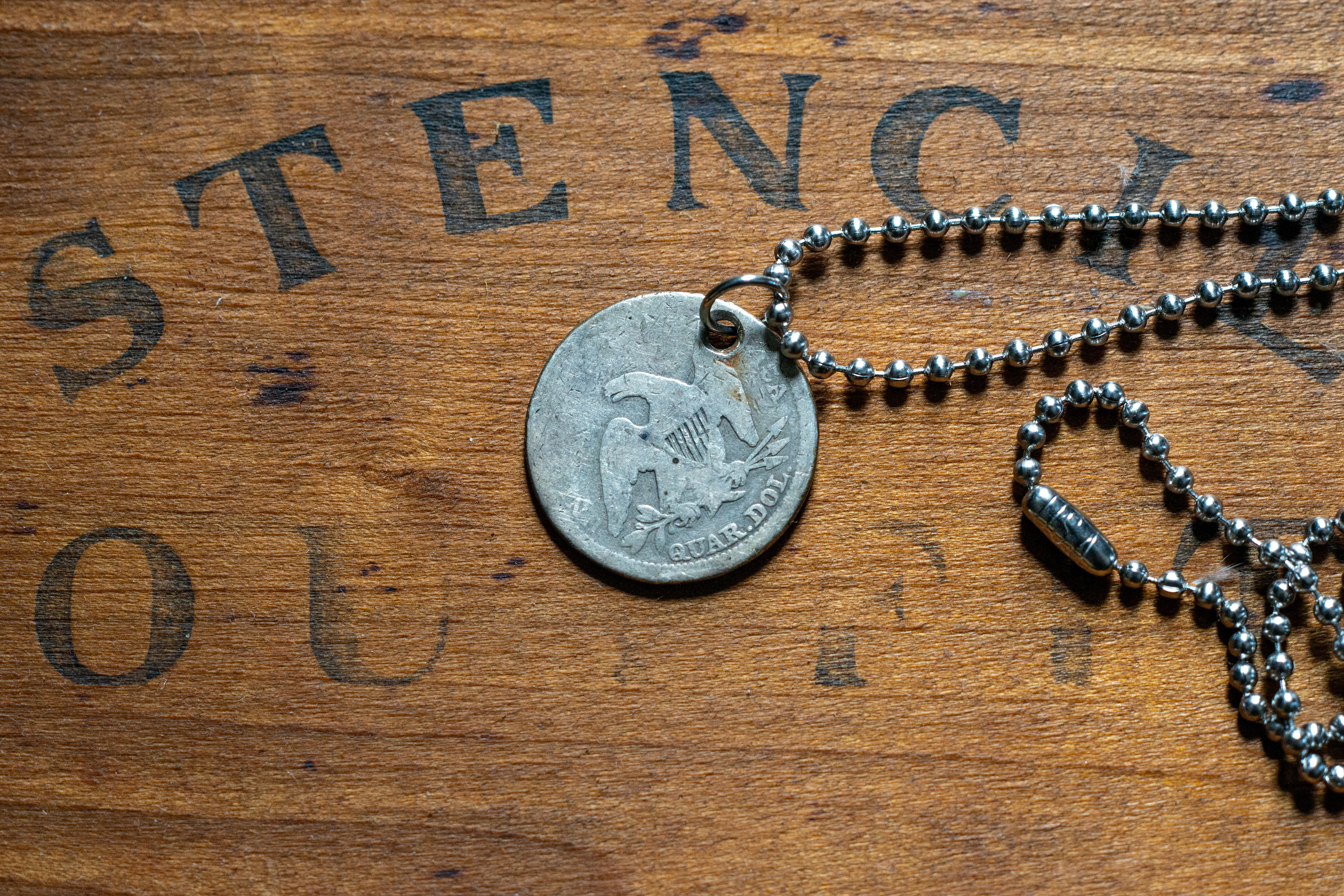 Assembled in New England using an authentic 1854 Liberty Seated Quarter and stainless ball chain made in the USA by the exclusive supplier to the US Military who has been making these chains for over 80 years. 30" necklace length chain and 4.5" keychain length chain included. All tools and parts used area also made by American Manufacturers. Own and wear a unique piece of history around your neck or share it with someone you know who appreciates American manufacturing and American history!