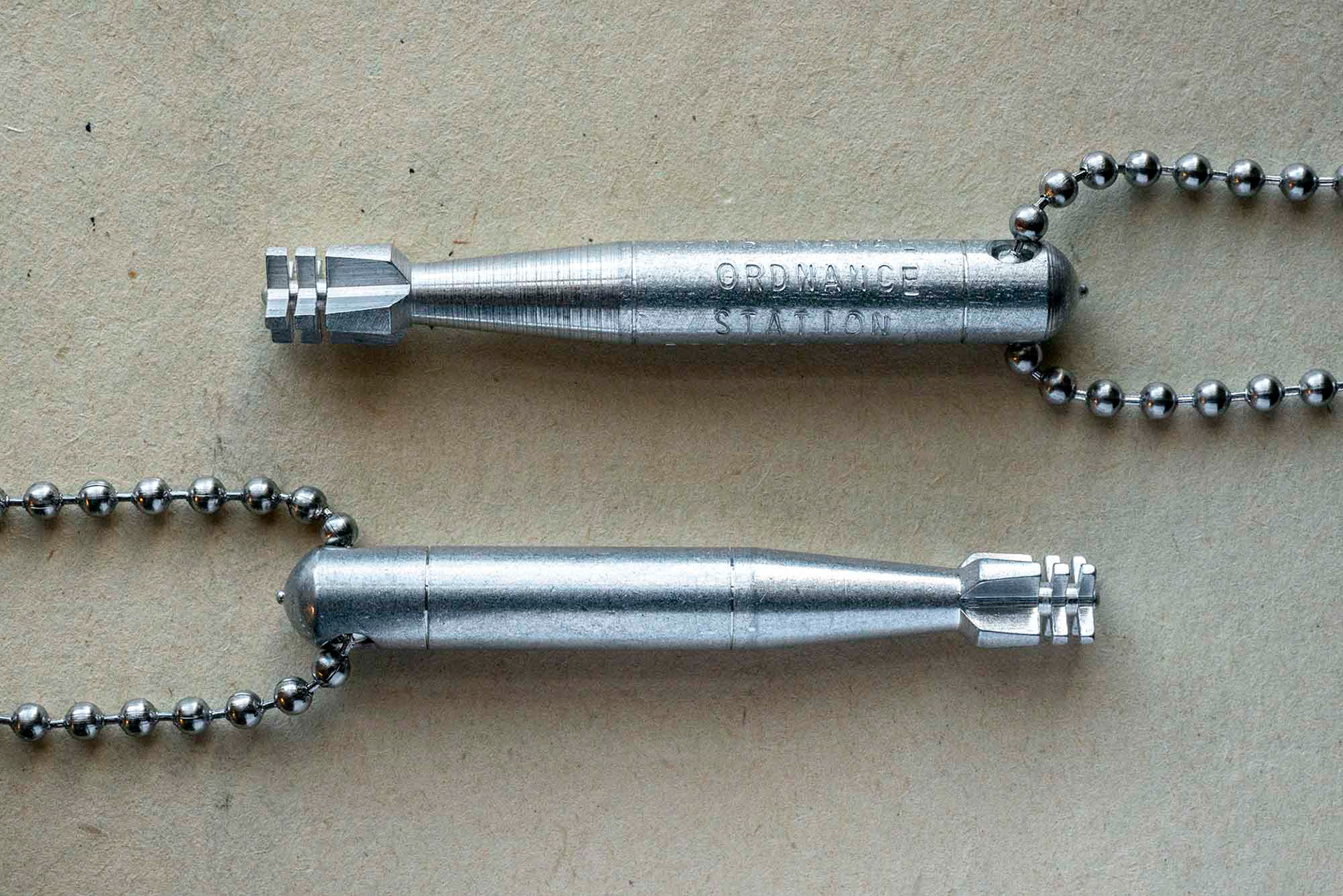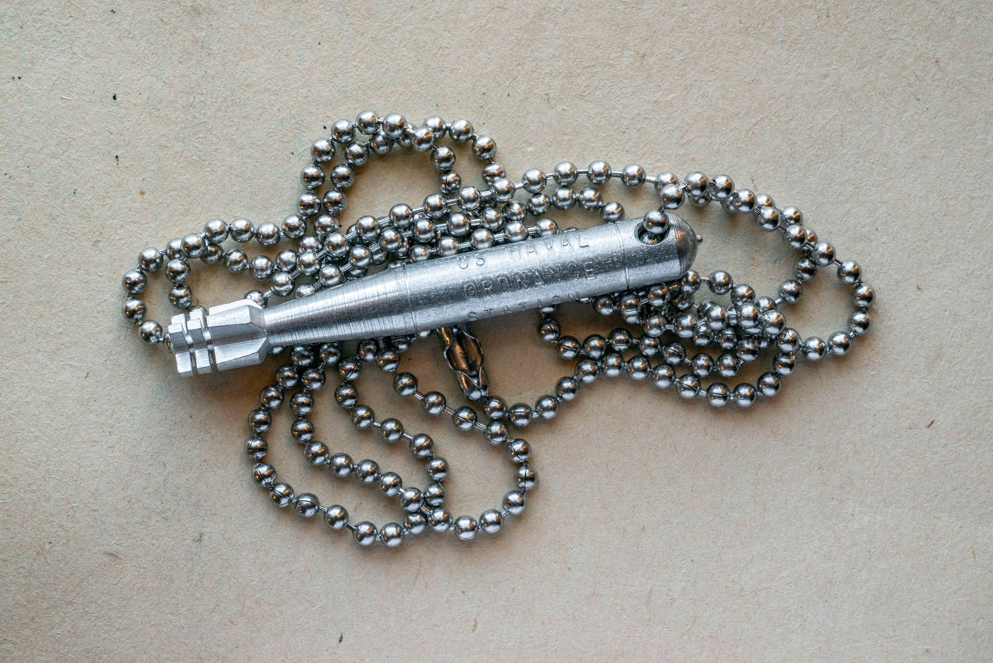 Limited edition torpedo necklaces assembled in New England out of original new old stock WWII era souvenir torpedos from the US Naval Ordnance Station, Forest Park and 30” stainless steel ball chains manufactured in the USA by the exclusive supplier to the US Military who has been making these chains for over 80 years. A 4.5” extension is also included with each order if you want to use the torpedo as a keychain.